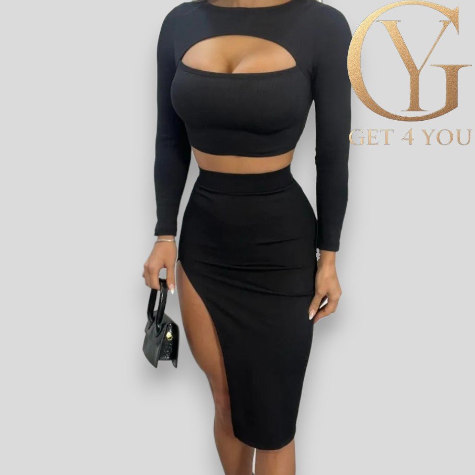 Съблазнителен, елегантен и дръзко модерен – комплектът “Fatal Allure” от GET 4 YOU включва дълъг ръкав crop top с ефектен изрязан отвор и вталена пола с висока талия и провокативна странична цепка. Еластичната материя прилепва перфектно по тялото и подчертава извивките със стил. Идеален за парти, вечеря или събитие, където искаш да оставиш впечатление.